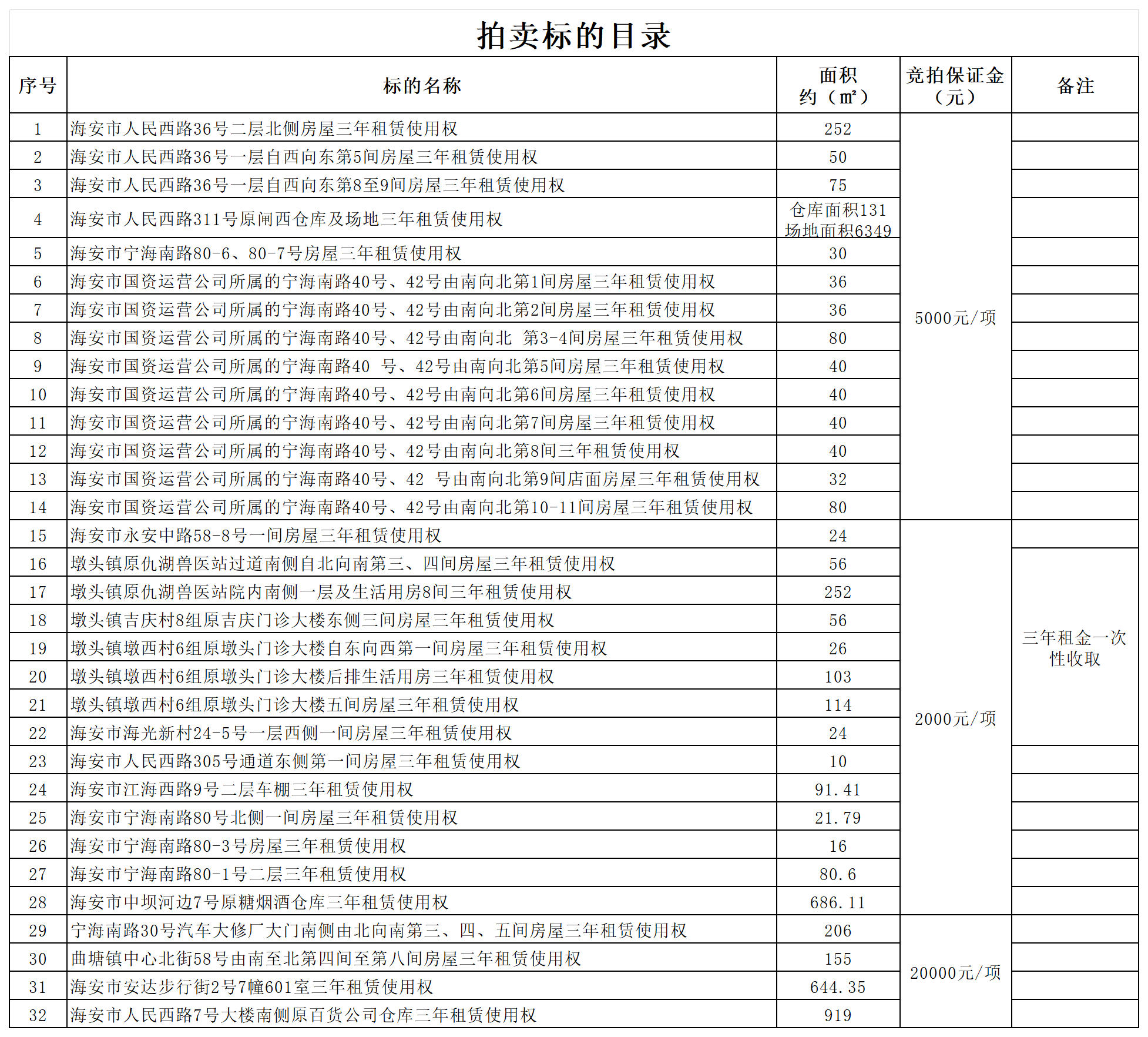 三、报名登记办法:凡有意向参加竞买者,个人凭本人身份证件、单位凭营业执照复印件(加盖公章)等有效手续及竞买保证金(标的1-14为5000元/项、标的15-28为2000元/项、标的29-32为20000元/项)缴纳凭据于2024年11月26 日16时前到海安市中坝南路49号五楼502室办理竞买登记手续。保证金请于2024年11月26日16时前汇入下列账户,户名:南通紫琅拍卖有限公司,账号:32001647136052518023,开户行:建设银行海安支行。